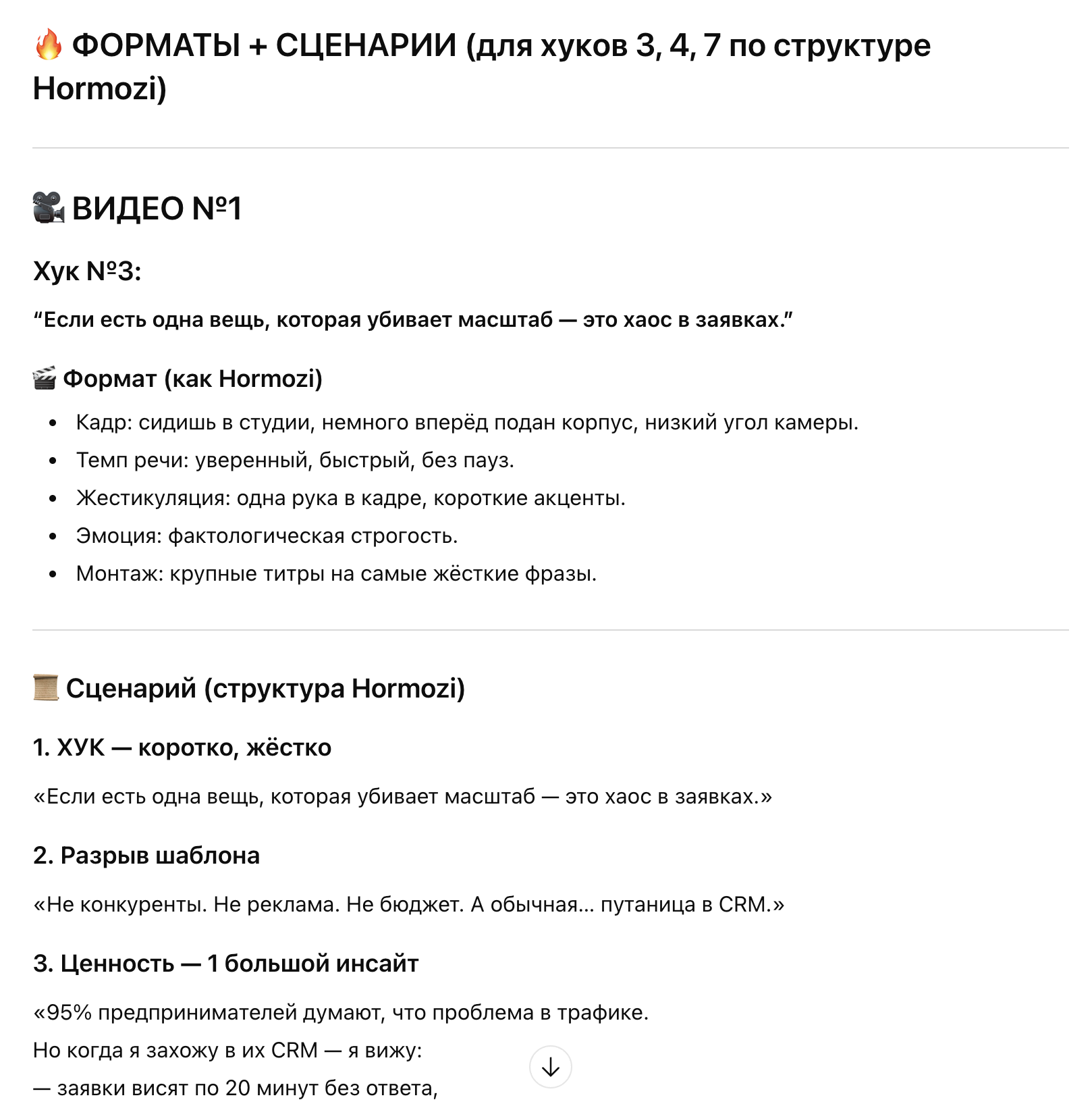5. Как только я подтвержу идеи, предложить форматы видео для выбранных идей и хуков. 6. После утверждения форматов, предложить сценарий. Задай мне все вопросы чтобы сделать работу лучше.