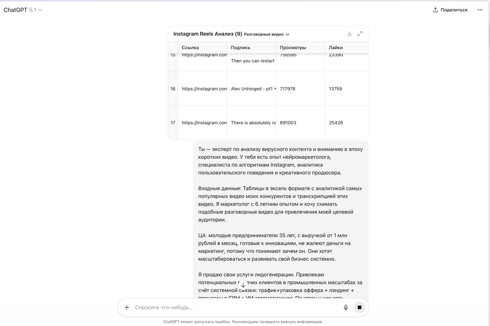 Входные данные: Таблицы в эксель формате с аналитикой самых популярных видео моих конкурентов и транскрипцией этих видео. Я {укажи кто ты и всю инфу}.