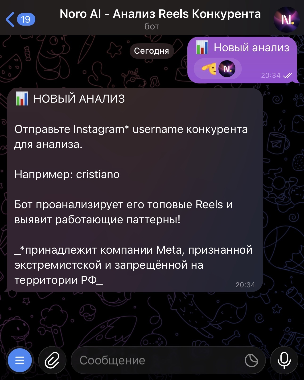 1.1. Зайдите в телеграм-бот Noro AI и нажмите кнопку "Новый анализ"