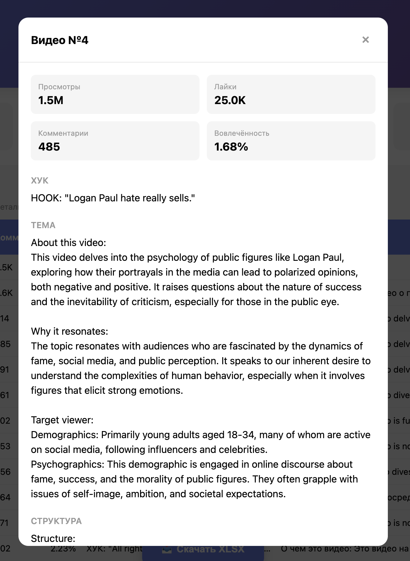 2.2. Вы видите по каждому найденному видео следующие параметры: просмотры, лайки, комментарии, ER (вовлечение), ХУК, Структура видео, Тема видео и Полная транскрипция.